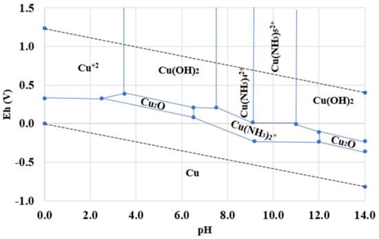 The behavior of copper species in the electrolyte can be evaluated using the Eh-pH diagrams, also known as the Pourbaix diagrams. These diagrams elucidate the stability of species in the aqueous system by highlighting the dominating species where multiple species co-exist. Z. Sun et al., [16] reported an Eh-pH diagram for 1 mol/L Cu and 1 mol/L NH3 for the pH range of 5.0–11.0 and reported Cu(NH3)42+ and Cu(NH3)2+ as the dominating copper species within the pH range of 8 and 11, depending upon the Eh of the system [16]. Outside the pH range of 8 and 11, copper existed as Cu(OH)2, CuO2, and CuO. Some other authors proposed the same Eh-pH diagram for the copper activity of 0.5 and 7 kmol/m3 of ammonia concentration and reported the same species against slightly different Eh and pH ranges [8,9,10,11]. Velásquez-Yévenes & Ram [14] also presented an Eh-pH diagram for 1 mol/L Cu and 1 mol/L NH3, but their species and respective Eh and pH differ. Their species only included CuO and Cu2O and omitted Cu(OH)2 with a very small Eh-pH range for Cu(NH3)42+ and Cu(NH3)2+ as compared to other available Pourbaix diagrams [14].