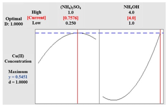 To identify the maximum solubility of copper sulfate and hence Cu(II) in the ammonia-sulfate-based electrolyte, the concentration of electrolyte components (NH4OH and (NH4)2SO4) varied as indicated in Table 3. The effects of anion and cation, NH4+ and SO42- were not the primary scope of this study. Still, the results indicated that the concentration of sulfate anions impacted copper solubility as sulfate ions reduced the solubility of copper [17]. The obtained data was analyzed, and the optimum concentration of electrolyte components was obtained, as shown in Figure 5 where the maximum concentration of copper can be achieved against 0.7576 M and 4.0 M of (NH4)2SO4 and NH4OH.