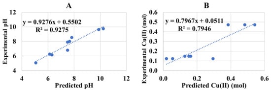 Statistical analysis was performed using the back elimination method for significant values having p-value < 0.05 and predictive statistical models were obtained for pH and Cu(II) concentration. These predictive models (valid for ranges in Table 3, Table 4 and Table 5) are given in Equations (15) and (16) with their goodness of fit with experimental data displayed in Figure 6. The higher adjusted R2 shows the goodness of these predictive models.