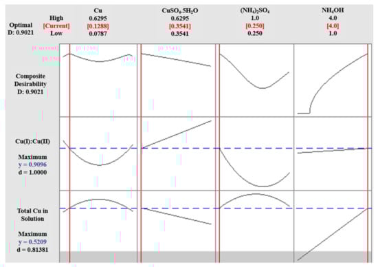 Optimization plot for Cu(I):Cu(II) ratio maximization at low pH (Experiment 2A). (All concentrations are in mol/L, and D is the desirability function used for optimization with values between 0 and 1 and 1 being most desired. y represents the obtained value of desirability function. The blue line (dash line) represents the maximum and red line shows the optimum conditions).