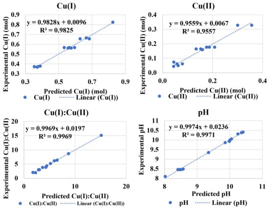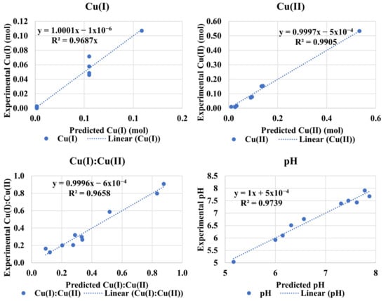 The predictive models (valid for ranges in Table 4) for Cu(I), Cu(II), Cu(I):Cu(II), and pH were obtained from statistical analysis of the data using the back elimination method to only include the significant variable with p < 0.05. The comparison of these models with experimental data (Figure 8) and higher Adj. R2 of Equations (17)–(20) support the goodness of models.