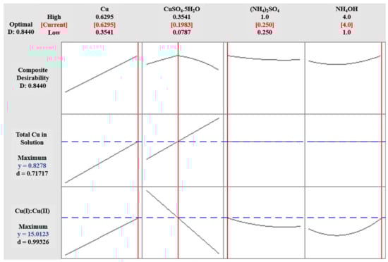 When metallic copper was added to the Cu(II) solution at a lower pH range of 5.04–7.91, most of the copper sulfate remained undissolved in the solution. At a lower or acidic pH, the copper forms insoluble compounds that precipitate, ultimately resulting in a very small amount of Cu(I) formation due to limited Cu(II) availability to react with Cu(0). The obtained data was analyzed for optimization and predictive statistical models. The maximum Cu(I):Cu(II) ratio can be obtained at 0.250M and 4.0M (NH4)2SO4 and NH4OH, respectively, as shown in Figure 7. The metallic copper and copper sulfate concentrations were minimal because the pH indicated the thermodynamic and oxidizer limits.