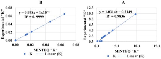 Comparison of visual MINTEQ and experimental equilibrium constant (K) for (A) Low pH (Experiment 2A) and (B) High pH (Experiment 2B). The points are the experimental and prediction data and the dotted line depicts the goodness of fit which is represented by the R2 values along with the equation of line.