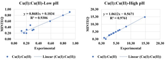 To validate the suitability for use experimental data was compared to that produced by Visual MINTEQ for the equilibrium constant “K”. The equilibrium constants were calculated for each experiment using the Cu(I) and Cu(II) concentrations. These K values were less than 1 for low pH experiments, indicating that most species are unreacted and present as reactants. On the other hand, the high pH experiments showed K values slightly higher than 1, indicating that the reaction favors the formation of products [23]. The statistical predictive models for low and high pH are given in Equations (25) and (26), respectively, and a comparison of visual MINTEQ data with experimental data is presented in Figure 11.