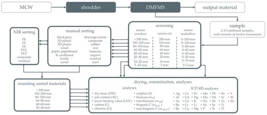 Sampling was performed with a machine setting of the Austrian company Komptech GmbH (Kühau, Frohnleiten, Austria). For a more detailed description of the machine setup, refer to Lasch et al. []. A pre-shredder (Terminator 5000 SD with cutting tool F, 60% shaft rotation speed, cutting gap closed) was fed by a wheel loader and passed the waste to a digital material flow monitoring system (DMFMS) with a swiveling conveyor. Individual increment samples were taken from the falling material stream from the conveyor by swiveling the conveyor back and forth over the shovel (width 2.6 m) of a wheel loader every 60 s taking two sample increments each minute. After three minutes, six increments were taken, and the shovel was emptied into several 0.24 m3 waste bins, whereby the bins formed one of ten combined samples. After six increments were drawn for all ten composite samples, another equivalent pass was made and poured into the same bins from the first pass. Thus, one composite sample consists of twelve increments, resulting in a minimum composite sample mass of 144 kg. Finally, the samples were weighed and then stored for further analysis. The total time required for sampling was 130 min. The throughput was 31,750 kg in total and a sample mass of 1545 kg was collected for the ten combined samples. An overview of the methods and procedures used to obtain the presented results is given in Figure 1.