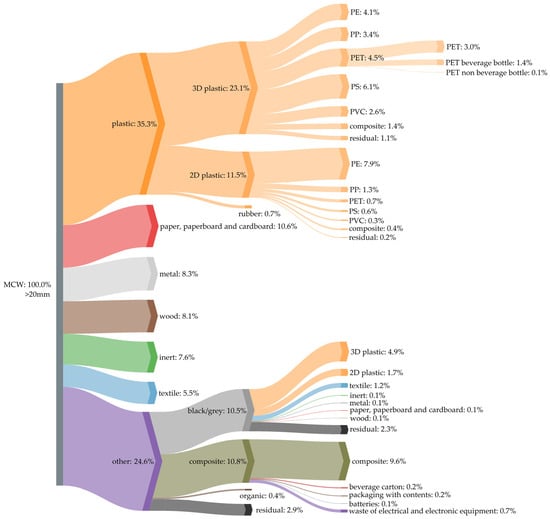 In Figure 2, the average composition of the sampled MCW across all sorted particle sizes > 20 mm is illustrated in a Sankey diagram (created in Origin version 2022b). The individual fractions are grouped into material classes to facilitate comparison with the data of previous studies presented in the introduction. To ascertain the average composition, the masses of individual fractions were first aggregated across all ten combined samples, and then divided by the total mass encompassing all samples (see Formula (2)).