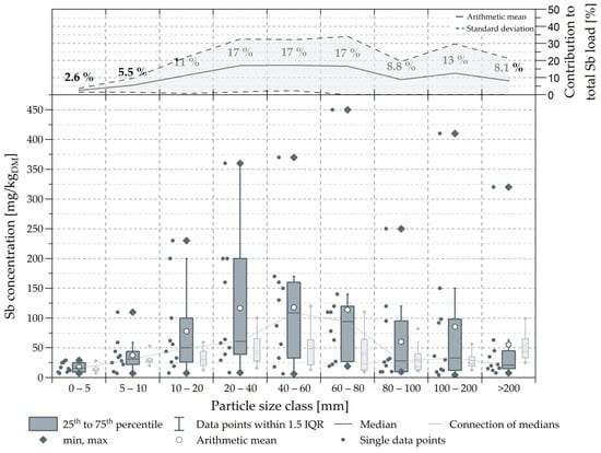 Top: The share of each particle size fraction to the total antimony (Sb) load. Below: The darker box plot represents the values found in this study, while the lighter box plot shows the values from Viczek et al. [].