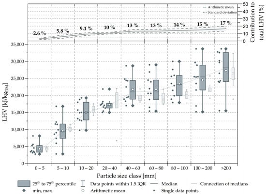 Top: The share of each particle size fraction to the total lower heating value (LHV). Below: The darker box plot represents the values found in this study, while the lighter box plot shows the values from Viczek et al. [].