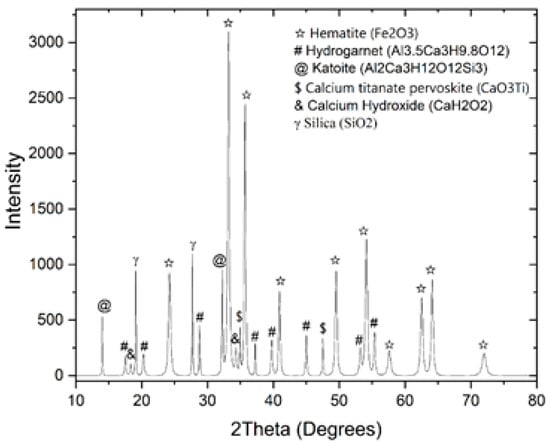 As shown at Figure 2, and Table 4, XRD-analysis for the red mud evidenced the following phases: hematite, calcium titanate perovskite, katoite, calcium hydroxide, silica and hydrogarnet.