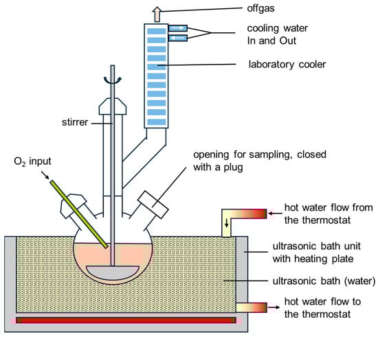 Additionally ultrasound assisted leaching process was used for slag and bauxite residues. The ultrasonic leaching setup is shown schematically in Figure 5. A flask with a capacity of 500 mL is immersed in a heatable ultrasonic bath. A gas supply is connected, which injects oxygen directly into the suspension at a flow rate of 1 L/min. The suspension is constantly swirled by a half-moon stirrer at 250 rpm. A laboratory cooler is also connected for condensing evaporating suspension. The water bath is kept at the desired temperature by the integrated heating plate of the ultrasonic device and by an external flow thermostat. The entire test setup is in a fume hood.