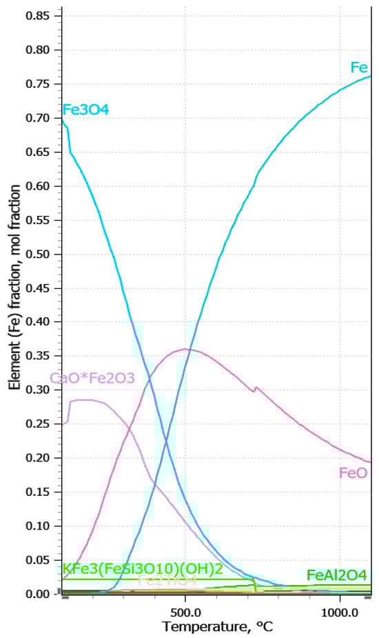 Pineau et al., 2006 [] found that reduction of iron ores with hydrogen leads to compact iron layers that could slow their reduction rate. Additionally, thermochemical analysis revealed the formation of Fe2TiO4 and FeAl2O4, which can lead to formation of passivation layer in reduction process. The formation of ferrite phases is expected for other elements such as calcium and sodium. Analysis of different phase during hydrogen reduction has performed using FactSage software 8.0 as shown at Figure 7 and Figure 8 [].