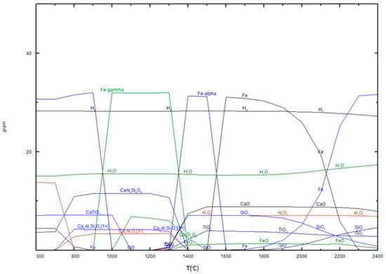 Equilibrium calculations were firstly done to identify relevant species and changes in chemical composition of red mud shown in Table 4. during hydrogen reduction at different temperatures until 1100 °C, as shown in Figure 6.