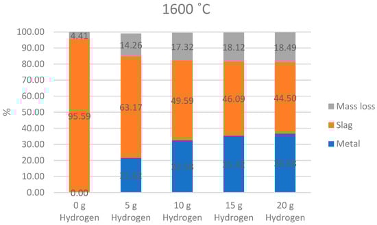 The bar chart illustrates the distribution of mass loss, slag, and metallic products at 1600 °C under varying hydrogen inputs (0 g, 5 g, 10 g, 15 g, and 20 g).