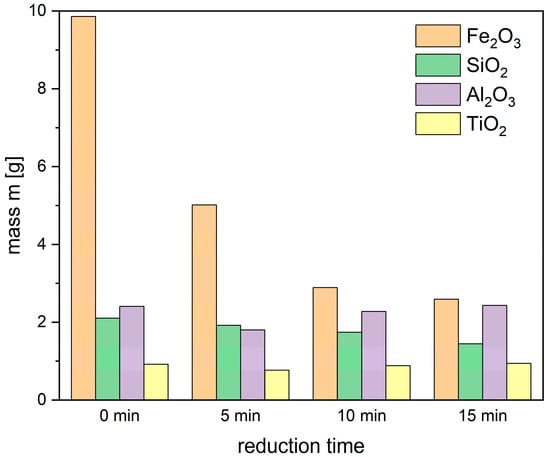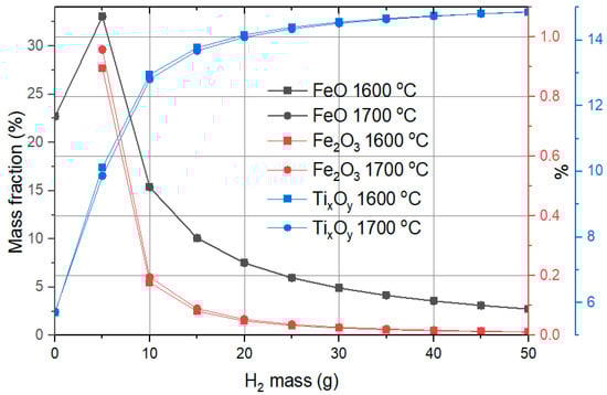 As illustrated in Figure 9, the calculations (results based on the FactSage software 8.0 predictions) show a significant reduction in Fe2O3 concentration (represented by the red line and red y-axis), dropping from 46% in red mud to less than 1% mass fraction with just 5 g of hydrogen. The formation of FeO originates from the reduction of Fe2O3. At lower hydrogen masses, FeO constitutes a significant fraction, but its amount decreases as the hydrogen mass increases, due to further reduction to metallic Fe. By the time 30 g of hydrogen is used, the FeO fraction drops below 5%. Other compounds in red mud do not undergo reduction in the same manner; instead, they undergo phase changes, such as the release of CO2 or other gases, under high-temperature conditions. The mass fraction of TixOy (primarily TiO2 with a minor presence of Ti2O3) increases in the slag from 4.2% to nearly 15%. A hydrogen mass of 20 g raises it to 14%, with further increases in hydrogen showing negligible impact on the slag composition. An increase of reduction temperature from 1600 °C to 1700 °C does not show a significant influence on the compound mass fraction in slag.