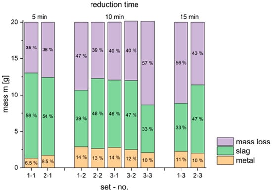 As the hydrogen input increases, the metallic fraction continues to grow, reaching 32.58% at 10 g of hydrogen and 36.68% at 20 g. Correspondingly, the slag fraction declines, reaching 44.50% at 20 g. This trend indicates the progressive reduction of oxides to metallic phases with higher hydrogen mass. However, the mass loss stabilizes after an initial increase, remaining relatively constant between 17.32% and 18.49% for hydrogen inputs from 10 g to 20 g.