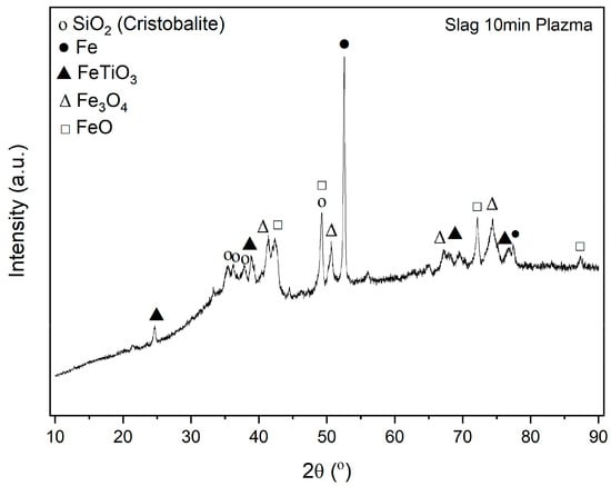 Plasma pyrolysis is an emerging technology that has great potential for the large-scale production of low-carbon and affordable hydrogen []. It is known, that atomic hydrogen and hydrogen plasma are more powerful as reductant compared to molecular hydrogen. Hydrogen plasma can resolve the thermodynamic barrier where it can theoretically reduce unreducible oxides such as SiO2, CaO, and MgO [,]. However, studies report that some of the oxides (i.e., Al2O3, TiO2) were only reduced into suboxides. BR is mixture of (Fe2O3, Al2O3, TiO2, SiO2, CaO, and MgO). Therefore, reduction of dried bauxite with hydrogen plasma opens new field for studies.