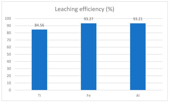 The leaching efficiencies for titanium, iron, and aluminum demonstrate the effectiveness of the process. Titanium achieved a leaching efficiency of 84.56%, indicating that a substantial portion was dissolved into the leachate, though some remained in the solid residue, what is more than shown in the literature data shown in Table 2. Iron, with an efficiency of 93.27%, was extracted at a high rate, showing excellent dissolution under the applied conditions. Similarly, aluminum exhibited a leaching efficiency of 93.21%, comparable to iron, reflecting the suitability of the parameters for its recovery. These results highlight the overall optimization of the leaching process offering a detailed analysis of mechanism of process, as shown with chemical equations []:
