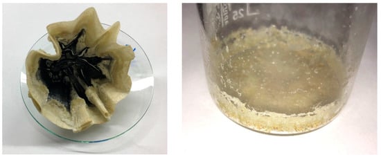 Silica gel formation was observed in the test series of ultrasound assisted leaching of slag. All undiluted and unacidified samples formed a gel after standing for a few days. However, no gelation occurred in the diluted and acidified samples. The slag leachate exhibited the quickest gelation, with the solution leached at 50 °C forming a gel overnight, while the solution leached at 80 °C began to gel during filtration. The filter and beaker used to collect the silica gel residue are shown in Figure 17. Additionally, the consistency of the silica gel varied. The gel formed from red mud leaching could be broken down into a viscous, partially lumpy fluid by shaking. In contrast, the silica gel from the slag leached at 50 °C remained dimensionally stable even when shaken. The gel from the slag solution leached at 80 °C became solid within hours.