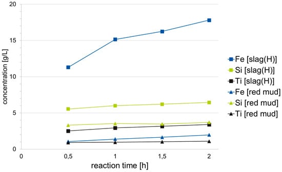 The change in concentration of selected elements over the duration of the test can be seen in Figure 18 using the example of leaching at 50 °C. This shows that the leaching of silicon and titanium is not very time-dependent, but is almost completely completed after 30 min. The elements aluminum and calcium, which are not shown in Figure 19, are also not time-dependent. Small, steady increases in concentration can be explained by losses through evaporation despite exhaust gas condensation and by losses when taking samples. Since these increases in concentration can be traced primarily to errors in the test execution, the analysis after 30 min, which is the most precise, is primarily evaluated below. Only the concentration of iron, particularly when leaching slag, increases so much with the test time that a time dependency can be assumed.