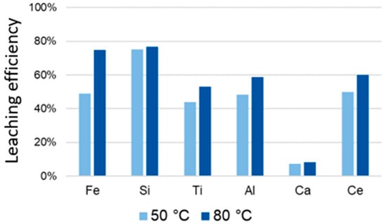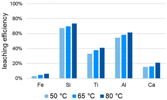 The leaching efficiency of silicon and the target metal titanium is increased by prior reduction. This corresponds to the goal of the greatest possible titanium mobilization, but the risk of silica gel formation is also increased by the improved leaching properties in addition to the concentration in the reduction. The leaching efficiency of aluminum and calcium is lower when leaching slag compared to BR (“red mud”). Since these two elements are not target metals, a low leaching efficiency is to be viewed positively. Temperature increases the leaching efficiency for all elements, both for BR and for slag as feedstock. The influence of a higher temperature in BR leaching can be seen in Figure 19. The low leaching efficiency of iron increases to 6% at 80 °C, so it is still suitable for separation. The maximum leaching efficiency of Titanium from BR is 40.7%.