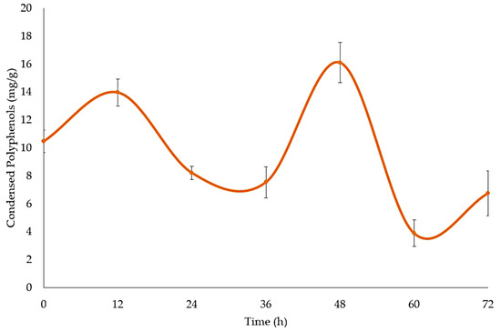 Figure 1 shows the kinetic behavior of the accumulation of condensed polyphenols in the fermentation process with Aspergillus niger GH1. In the first 36 h, a decrease in the content of condensed polyphenols was observed, reaching 7.53 mg/g. At 48 h, a maximum accumulation of 16.09 mg/g was reached. Subsequently, these values fell to 6.74 at 72 h. These fermentation kinetics for the accumulation of condensed polyphenols show that the best time was at 48 h. In a previous work, Aspergillus niger GH1 was able to grow and develop on complex substrates rich in polyphenols from creosote bush (Larrea tridentata Sessé and Moc. ex DC. Coville), pomegranate (Punica granatum L. var Wonderful), and cranberry (Vaccinium macrocarpon Ait.) [26].
