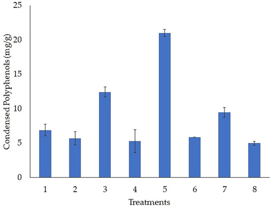 Figure 2 shows the accumulation of condensed polyphenols obtained via the Plackett–Burman experimental design. Treatment 5 achieved a condensed polyphenol accumulation of 21.04 mg/g, while treatment 4 only achieved a condensed polyphenol accumulation of 5.31 mg/g. There are very few works in the literature on fermentation processes with Aspergillus niger for the release of condensed polyphenols using black beans as a carbon and energy source. However, we can mention some; for example, some authors have studied the SSF process with filamentous fungi (Aspergillus awamori, A. oryzae, A. sojae, Rhizopus azygosporus, and Rhizopus sp. No. 2) to improve the polyphenol content. The authors concluded that SSF with filamentous fungi improves the levels of bioactive compounds in black beans [27]. The literature mentions that the accumulation of polyphenol content during fermentation is due to enzymes such as β-glucosidase, β-xylanase, and β-arabinofuranosidase, which can be produced by the Aspergillus genus. These enzymes break the bonds between phenolics and their glycosides, increasing the mobilization of bioactive components, releasing phenolics, and improving polyphenol content [28].