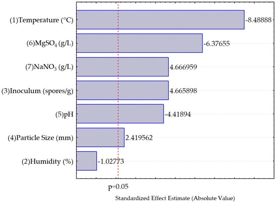 The analysis of variance (ANOVA) of the regression model is presented in Table 3. The model used in the experiment was as follows: p < 0.05; coefficient of determination R2 = 0.9195; and adjusted coefficient of determination R2Adj = 0.8843. The loss of fit term was not significant, indicating that the model is reliable and can be used to analyze and predict the effect of SSF process conditions on the content of condensed polyphenols using black beans as a substrate. From this analysis, it can be determined that most of the factors had significant effects on the response variable except for humidity. The order of the effect of each factor was temperature > magnesium sulfate > sodium nitrate > amount of inoculum > pH > particle size. Although significant results are obtained, we believe that the yields for the extraction of polyphenolic compounds using SSF can be improved. Some authors mention that optimizing the SSF process is an efficient strategy for improving phenolic content [35].