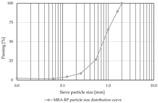 The selection of the recycled aggregate for this study was based on the results of the carbonation of 7 different recycle aggregates (RAs) used in the study of Bastos et al. [30]. The selection of the mixed recycled aggregate designated MRA-RP for this work was because it is a representative recycled aggregate with a low CO2 capture capacity, high porosity and a dominant presence in waste streams, making it an ideal candidate for amine treatment. This waste, previously characterized by Infante Gomes et al., referred to as CDW-A [31], as W1 [32] and by Bastos et al. as MRA-RP1 [30], corresponds to a mixture of particles with dimensions below 2 mm with a particle density of 2424 kg/m3, Figure 1. The selection of this RA was based on several key criteria. Firstly, it exhibited the lowest carbonation potential among all the studied recycled aggregates (RAs), presenting an opportunity to significantly enhance its CO2 capture capacity [30]. Secondly, as demonstrated in previous studies [30,31], this RA showed higher water absorption (7.1%) compared to several other RAs. High water absorption can be advantageous for the effective impregnation of amine solutions. Lastly, MRA-RP was considered the least valuable material overall among the available options; Table 1 presents the composition of MRA-RP. These combined characteristics made MRA-RP an ideal candidate for investigating potential improvements in CO2 sequestration through the incorporation of capture-promoting compounds.