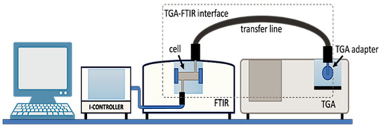 The TG-FTIR analysis was performed using an interface comprising a REDShift Evolved gas analyzer with a flux of 150 mL/min, as in Figure 2. The temperatures of the interface, transfer line and cell line were 280 °C, 280 °C and 250 °C, respectively. The interface line was coupled to a PerkinElmer FTIR Spectrometer Model Spectrum 2 and a HITACHI STA7200. The latter used a 200 mL/min nitrogen atmosphere at a 10 °C/min heating rate from 25 to 900 °C. The analysis was carried out using alumina crucibles.