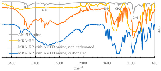A qualitative analysis was performed at different steps of the experiment using FTIR-ATR characterization. Figure 3 presents the spectra of the AMPD amine, MRA-RP (non-carbonated), MRA-RP with AMPD (non-carbonated) and MRA-RP with AMPD (carbonated). To assess if the amine was successfully impregnated, FTIR-ATR analysis was performed on the MRA-RP with and without AMPD impregnation. By analyzing both spectrums, the absorption bands of N-H and C-N detected in the samples impregnated with AMPD could mainly be attributed to the presence of the amine in the RA, the remainder being due to the existence of moisture [35,36,37,38,39]:
