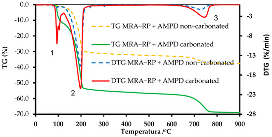 TG/DTG curves of MRA−RP with AMPD pre-carbonation and post-carbonation. Legend: 1—dissociation of carbamate; 2—AMPD amine vaporization; 3—CO2 release from decarbonation of calcium carbonate.