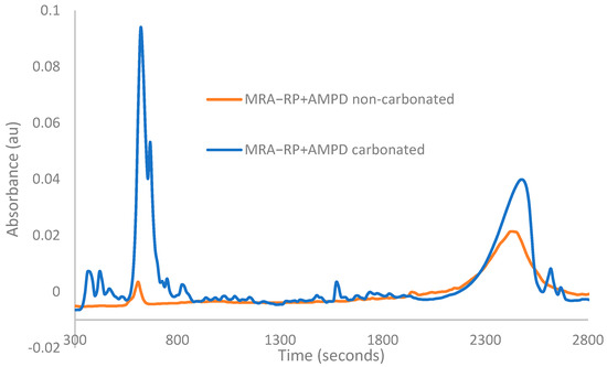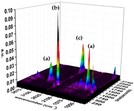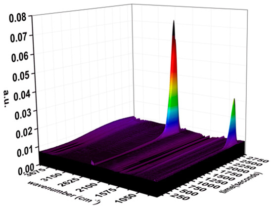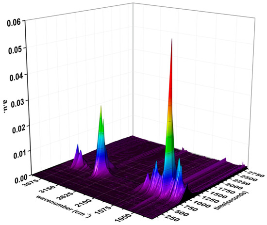 After analyzing AMPD and MRA-RP individually, TG-FTIR analysis was performed on the result of the impregnation process, MRA-RP with the AMPD amine. The results presented in Figure 7 support the thesis that the impregnation of AMPD into MRA-RP was successful, in accordance with previous analysis. The resulting spectrum is mainly the merging of the individual spectra of the amine and the RA, with it being possible to identify the two main regions previously mentioned: amine vaporization and CO2 release due to calcite decarbonation. It is also clear that a small signal appears at 600–700 s, which, according to the FTIR spectra, corresponds to CO2. This may be due to the high reactivity of the amine, which adsorbed CO2 during the impregnation process.