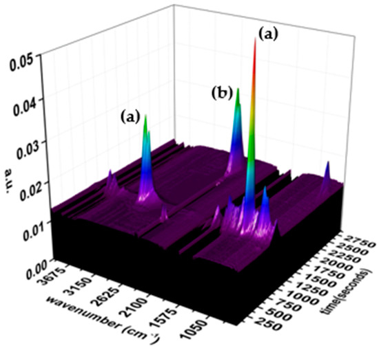 Before the analyzing the result of the impregnation process, it was necessary to analyze MRA-RP’s thermal behavior. The TG-FTIR results can be found in Figure 6. The results only display the release of CO2 due to the decomposition of the calcium carbonate present in the sample. The observed bands correspond to CO2 (2500–2300 cm−1, 750 cm−1) [44,45] released in the weight loss occurring at temperatures above 500 °C [30,46].