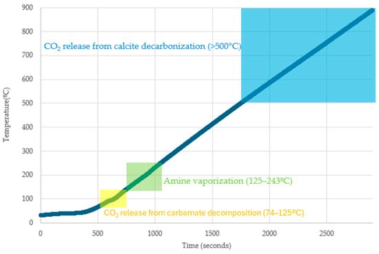 With the mixed RA successfully functionalized with the amine, it was subjected to a CO2-rich environment. Figure 8 and Figure 9 present the TGA-FTIR results for the MRA impregnated with AMPD after carbonation. The regions previously identified associated with amine vaporization (a) and calcite decarbonation (c) are still visible. However, the appearance of a new region is also visible, a large band between 600 and 700, in the temperature range of 90–120 °C, with a wavelength around 2400 cm−1, which corresponds to the CO2 molecule’s wavelength [44]. However, due to the temperature at which the event occurs, the idea that the released CO2 is from the decarbonation of calcium carbonate can be excluded [30]. It can also be hypothesized that such CO2 can only result from the thermal decomposition of the previously formed carbamate during the carbonation process. In fact, it is well documented that the reaction of carbon dioxide with an amine is reversible [47,48,49]. Correlating these results with the results obtained from the FTIR-ATR analysis, both provide evidence of chemical bonds associated with the carbamate compound. Also, the TGA-FTIR analysis of the carbonated sample clearly shows that the release of CO2 from carbamate decomposition occurs before amine vaporization. Therefore, it is possible to estimate the temperature range of the CO2 captured by the amine. That range is 74–125 °C, which corresponds to the CO2 resulting from the decomposition of carbamate, formed upon the amine reaction with CO2 during the carbonation process. On the other hand, between 125 and 243 °C, the amine vaporizes, while above 500 °C, the CO2 release is due to the decarbonation of calcium carbonate (Figure 9).