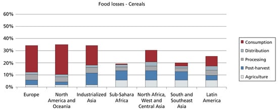 Production losses and waste at the FSC (food supply chain) stages, for cereals in a global comparison. Source: [18]. Europe and North America waste a lot in the consumption stage.