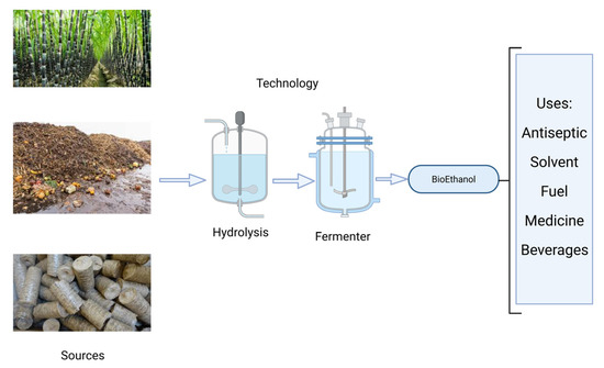 Energy sources are primarily divided into renewable (clean, “green”) and non-renewable types. Among these, biomass stands out as effective, readily and abundantly available, renewable energy source, demonstrating compatibility with environmental sustainability. Biomass energy can fulfill our energy requirements, serving as a primary energy source for electricity generation or as energy carrier in the form of gaseous and liquid fuels [64]. Biomass accounts for over 10% of the global energy supply and 13% of total energy consumption [65]. As stated above, significant volumes of agricultural waste are generated, which are often incinerated in rural regions of developing nations as a means of land clearance. This practice contributes to the escalation of greenhouse gas emissions and constitutes a waste of energy resources [66,67]. In several countries, amongst them the United States of America and Brazil, huge amounts of biofuels are manufactured. The use of biofuels reduces CO2 compared to fossil fuels [27]. While first generation biofuels (1G) use primary agricultural products such as starch, sugar or plant oils, second generation biofuels (2G) are made from waste biomass streams, typically through enzymatic degradation of lignocellulosic materials. 3G biofuels made from algae are on the horizon (Figure 4).