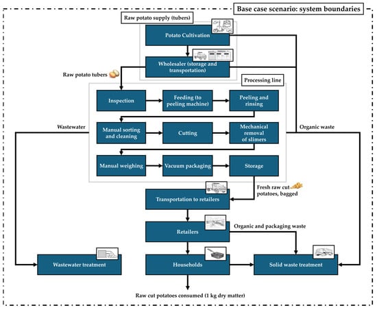 In this study, an LCA was conducted to evaluate the environmental impact of osmotically dehydrated fresh-cut, pre-packaged potatoes, intended for frying, and to compare it to conventional, untreated fresh-cut potatoes. For the dehydrated potatoes, both the use of market glycerol and glycerol from the treatment of used vegetable cooling oil were examined. The case study selected was a small processing line located in Naxos Island in Greece, where OD was examined and applied in the scope of the national project “Fresh4ever”, estimating the enhancement of the product’s shelf-life by up to 5 more days, which was especially valuable for the product intended for retailers in mainland Greece (Athens) []. The information on the infrastructure and operations was provided by the processing line operators. The analysis considered all stages of the product’s value chain, from the cultivation of potato tubers to the consumption at households, and examined all the different results of OD application, including the increased energy and material (additives and water) demand of the processing line, the difference in product volumes transported to retailers, the reduction of waste due to the enhanced shelf-life, the difference in energy requirements for storage, and the difference in raw potato tubers required.