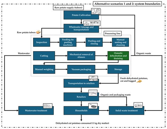 Alternative scenarios 1 and 2: dehydrated-cut-potato system boundaries.