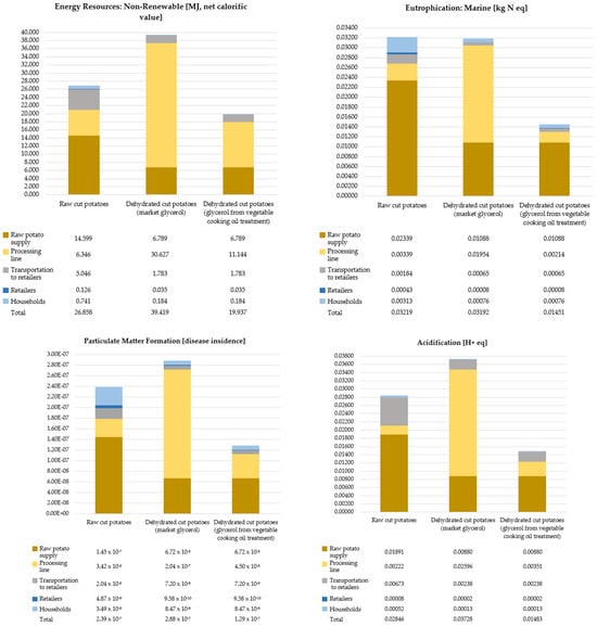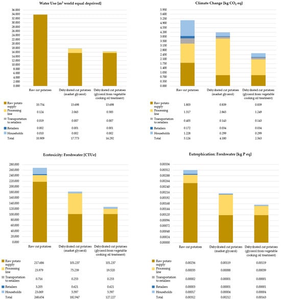 The LCIA results are presented in Figure 3 corresponding to the characterized results. A breakdown of the impact for each system/scenario is presented in the figure, below the graphs (from left to right, raw cut potatoes, dehydrated cut potatoes with the use of market glycerol, and dehydrated cut potatoes with the use of glycerol derived from vegetable cooling oil treatment). It is noted that the impact of the alternative scenarios (and the respective difference from the base case) was identical in all stages excluding the processing line.