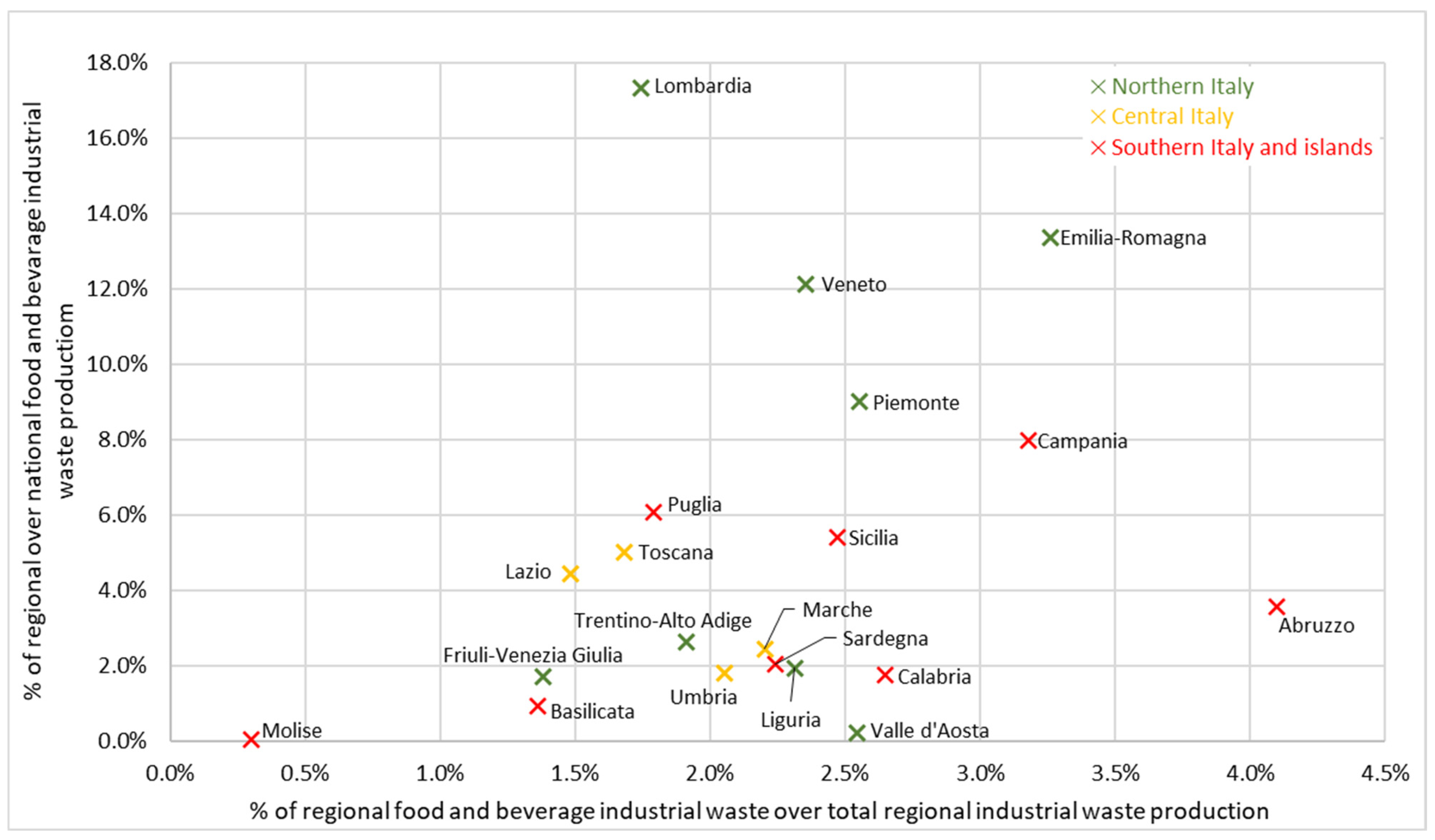 Region | Waste Production in Food and Beverage Industries (t/y) | Total Industrial Waste Production (t/y) | Regional % of Food and Beverage Industrial Waste in Terms of Total Regional Industrial Waste | Regional % of Industrial Waste Production for Food and Beverage Industry over National Industrial Food and Beverage Waste |