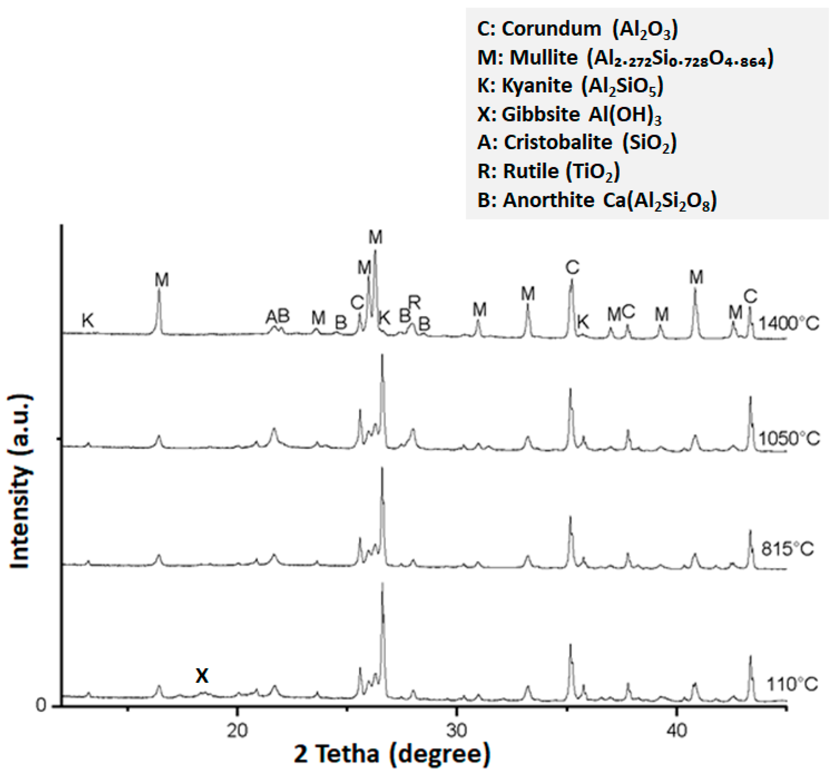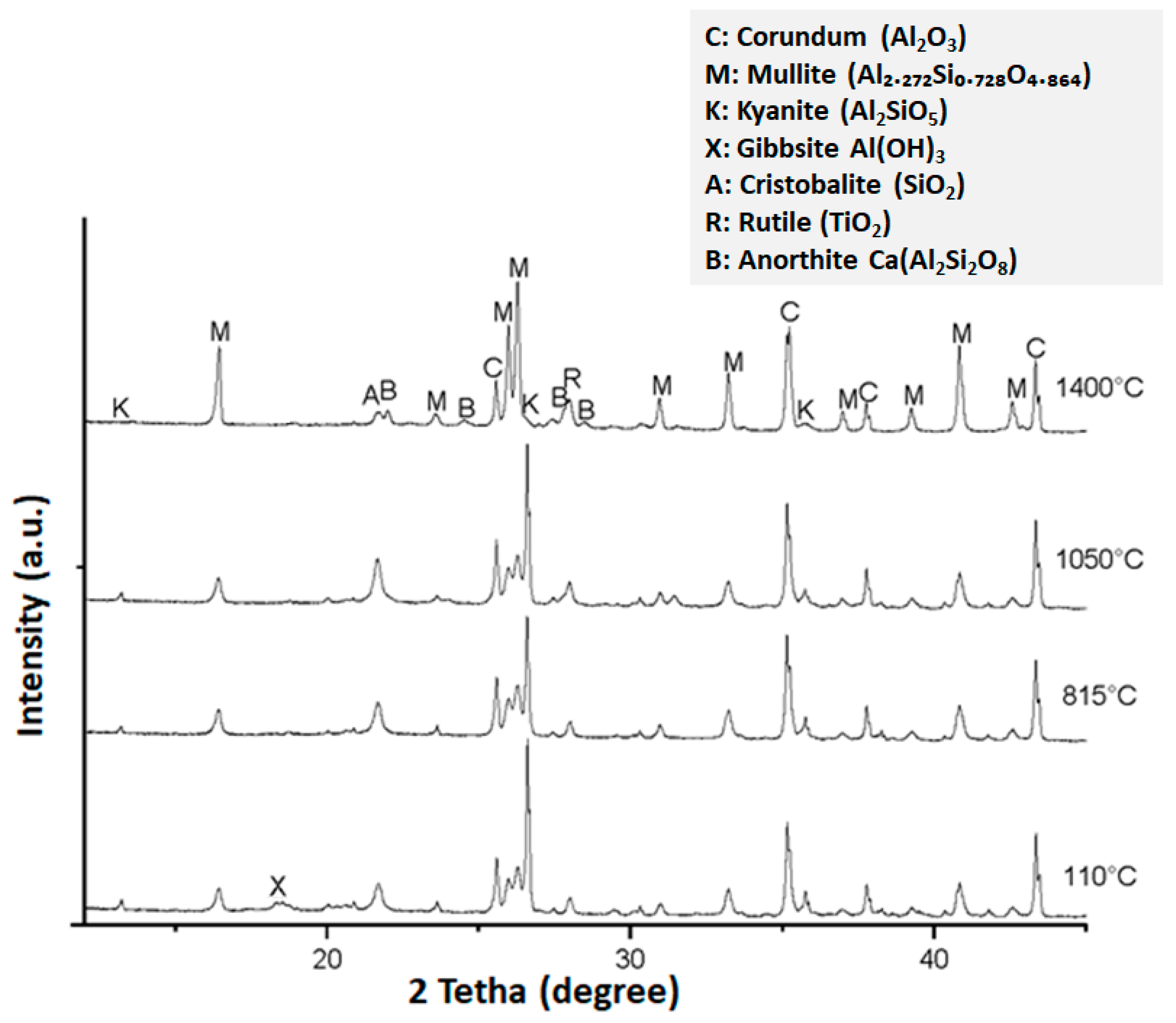 | Principal crystalline phases after firing | Mullite (primary), corundum, minor cristobalite/glass | Mullite, anorthite, corundum, cristobalite, glassy phase | Cristobalite/quartz, anorthite/glass, limited mullite |