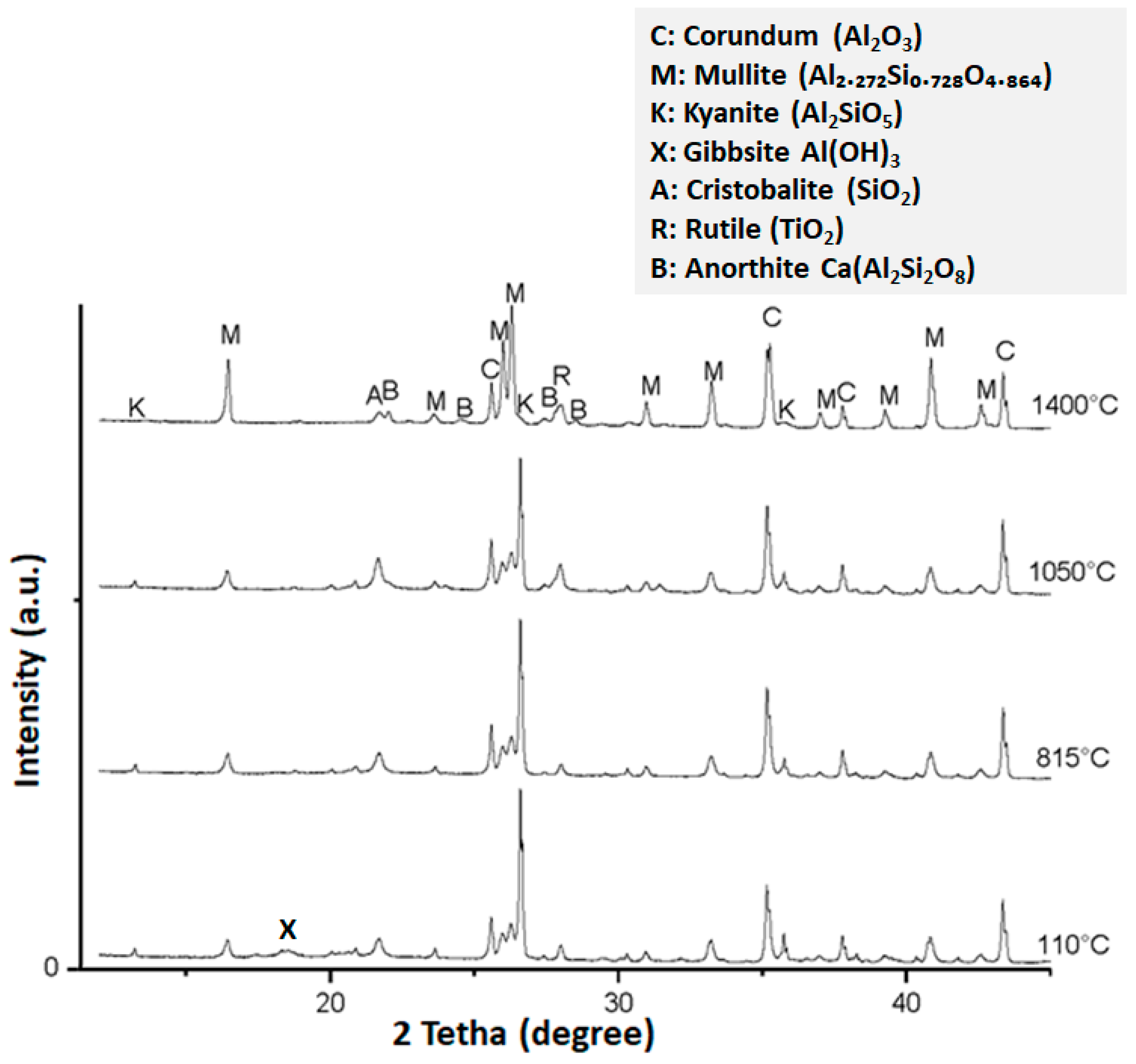 - Abou-Sekkina, M.M.; Abo-El-Enein, S.A.; Khalil, N.M.; Shalma, O.A. Phase Composition of Bauxite-Based Refractory Castables. Ceram. Int. 2011, 37, 411–418. [Google Scholar] [CrossRef]