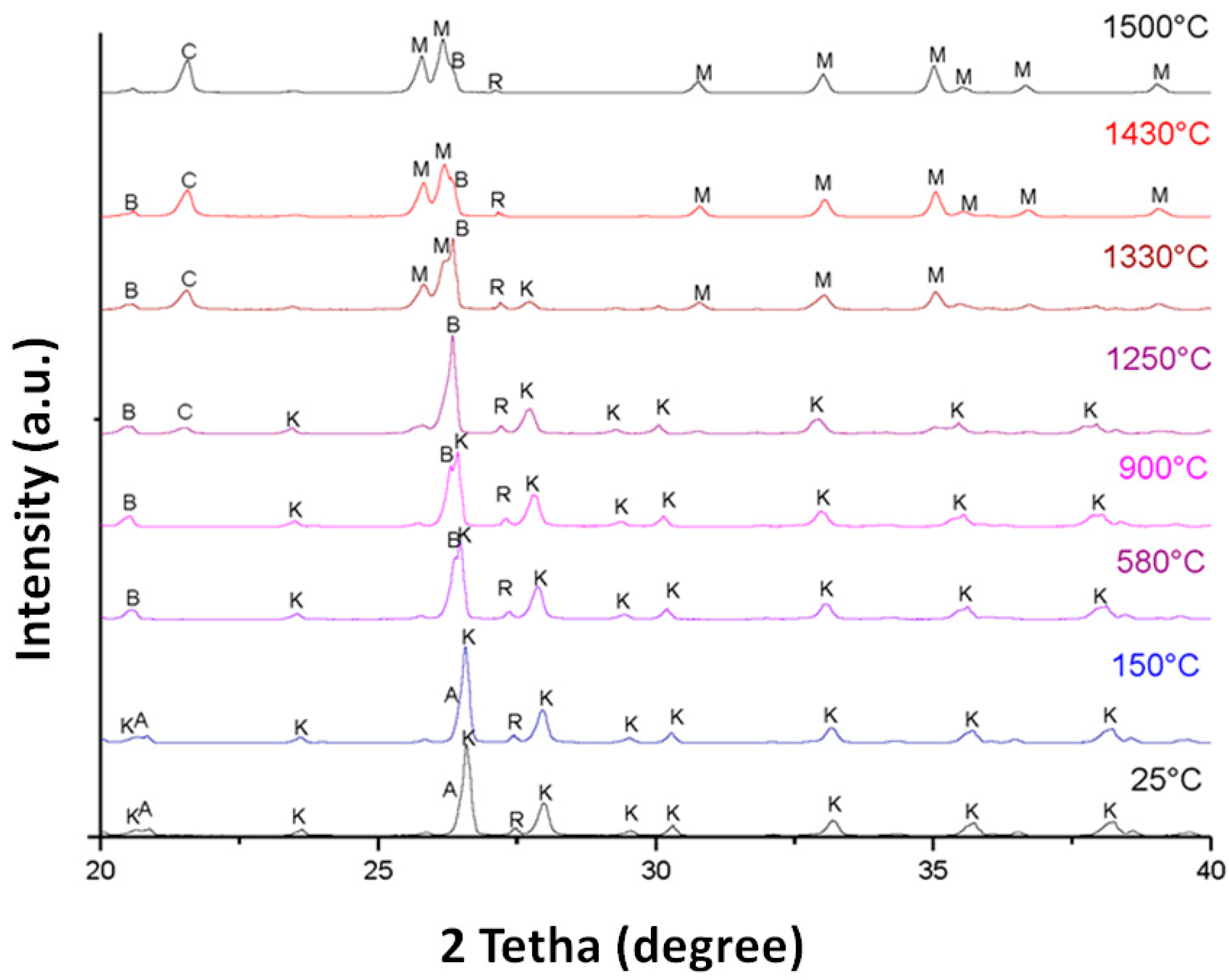 3.3.2. High-Temperature XRD (Thermodiffraction) Analysis of Secar 80 and Kyanite