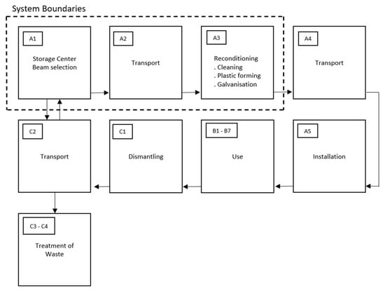 22], related to the reference EPD, defines that the system boundary to the next product system is the point when the waste has become a usable flow. In this study, that point was defined in the storage area, after the selection of the beams to be reconditioned. For this purpose, the beams to be reconditioned are considered secondary, reusable materials.
