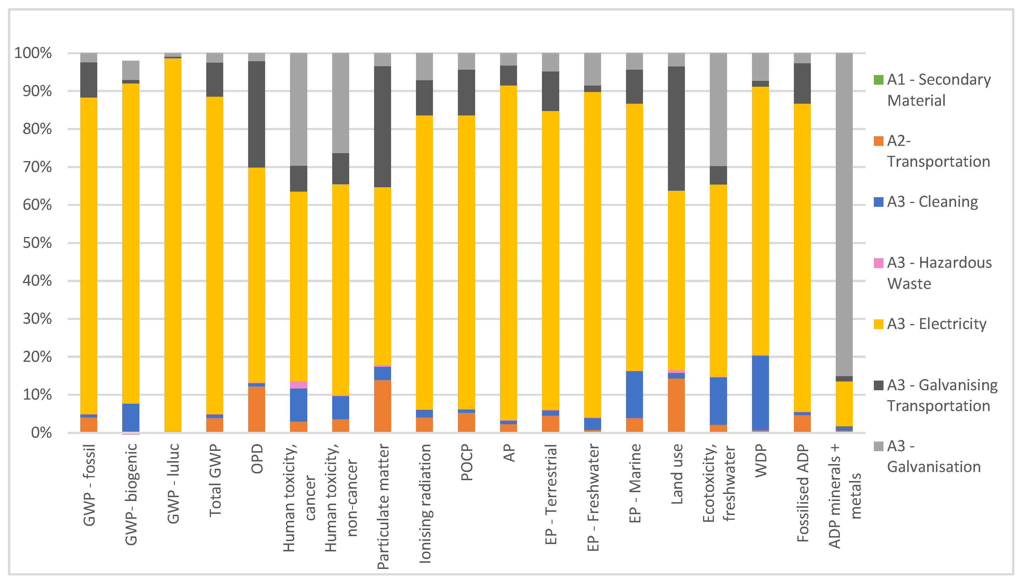 The input of secondary material (used beams) was calculated by subtracting the amount of zinc to be applied (54.05 kg) from the declared unit (1 ton) and was only included in the LCI as a reference, due to the system model used (allocation/cut-off). In this model, reused secondary materials are made available without environmental burdens. For this reason, in the LCIA stage, the secondary material input is zero.