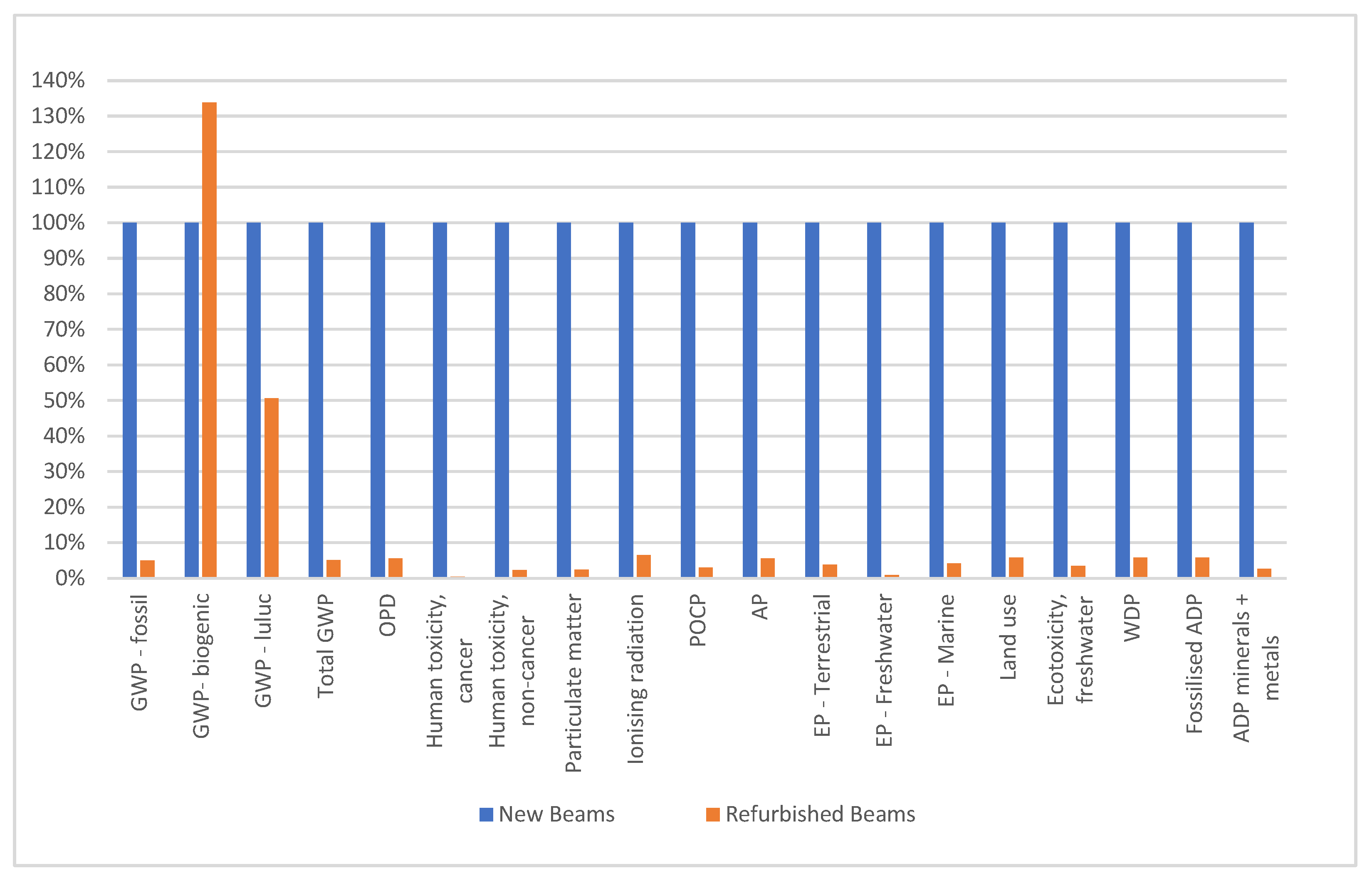 The study showed that most of the impacts of the reconditioning process derive from the use of electricity. The comparison with the traditional beam production process revealed that when primary raw materials are replaced by secondary raw materials, the environmental impacts associated with the production process decrease significantly. Of the 19 impact indicators assessed, 18 were lower, and 17 had a drop of more than 90% compared to the traditional production process. The reduction in impacts was most pronounced in indicators related to human health, followed by those of air and water pollution, the use of fossil fuels, mineral resources, and climate change. The only exception was the increase in biogenic carbon emissions, which was attributed to the use of the Portuguese energy mix.