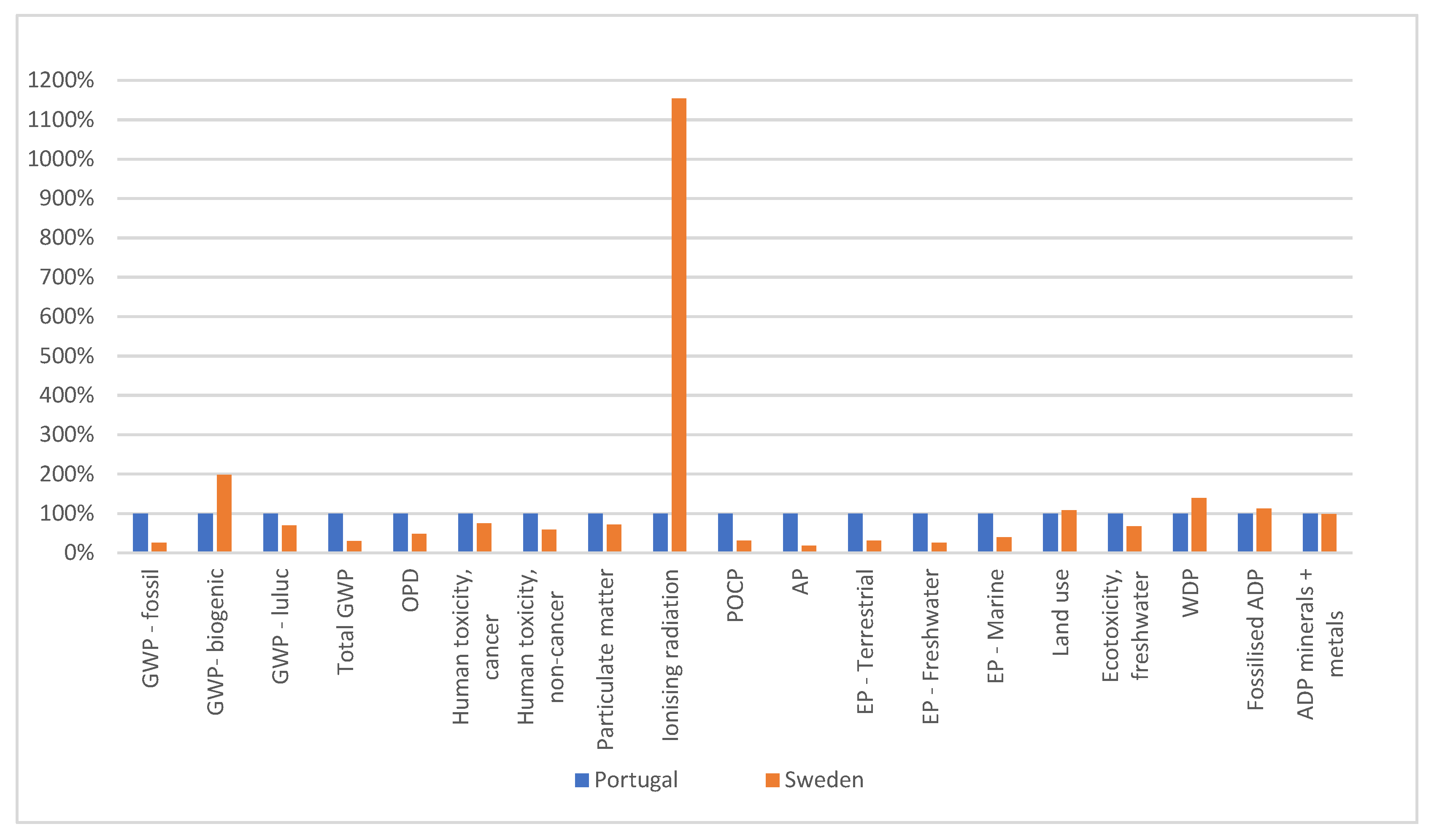 We can see that when we replace the Portuguese mix with the Swedish mix, keeping the rest of the data unchanged, there is a significant increase in GWP-biogenic (98.29%) and Ionizing radiation (1054,09%) and a reduction in the indicators GWP fossil (−74.63%), GWP total (−70.29%), POCP (−69.17%), AP (−82.16%), EP-terrestrial (−68.96%), EP-freshwater (−74.74%) and EP-marine (−60.21%).