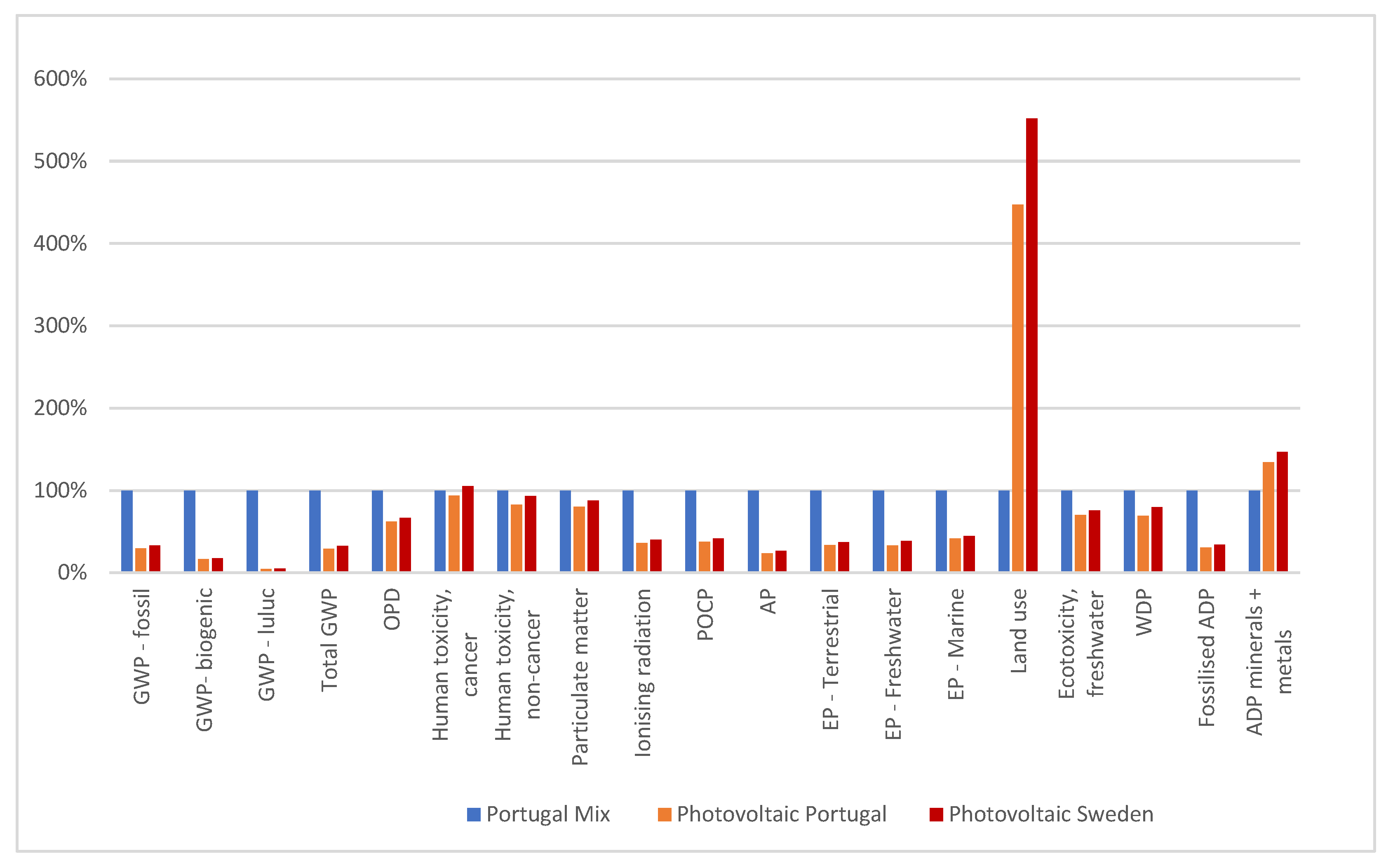 When we analyzed the modelling with Portuguese and Swedish photovoltaic energy, the environmental impacts were similar, with the indicators being slightly higher in Sweden. In general, photovoltaic generation has considerably lower environmental impacts in several impact indicators compared to the electricity mix, the main ones being GWP, AP, EP, and ADP fossil.