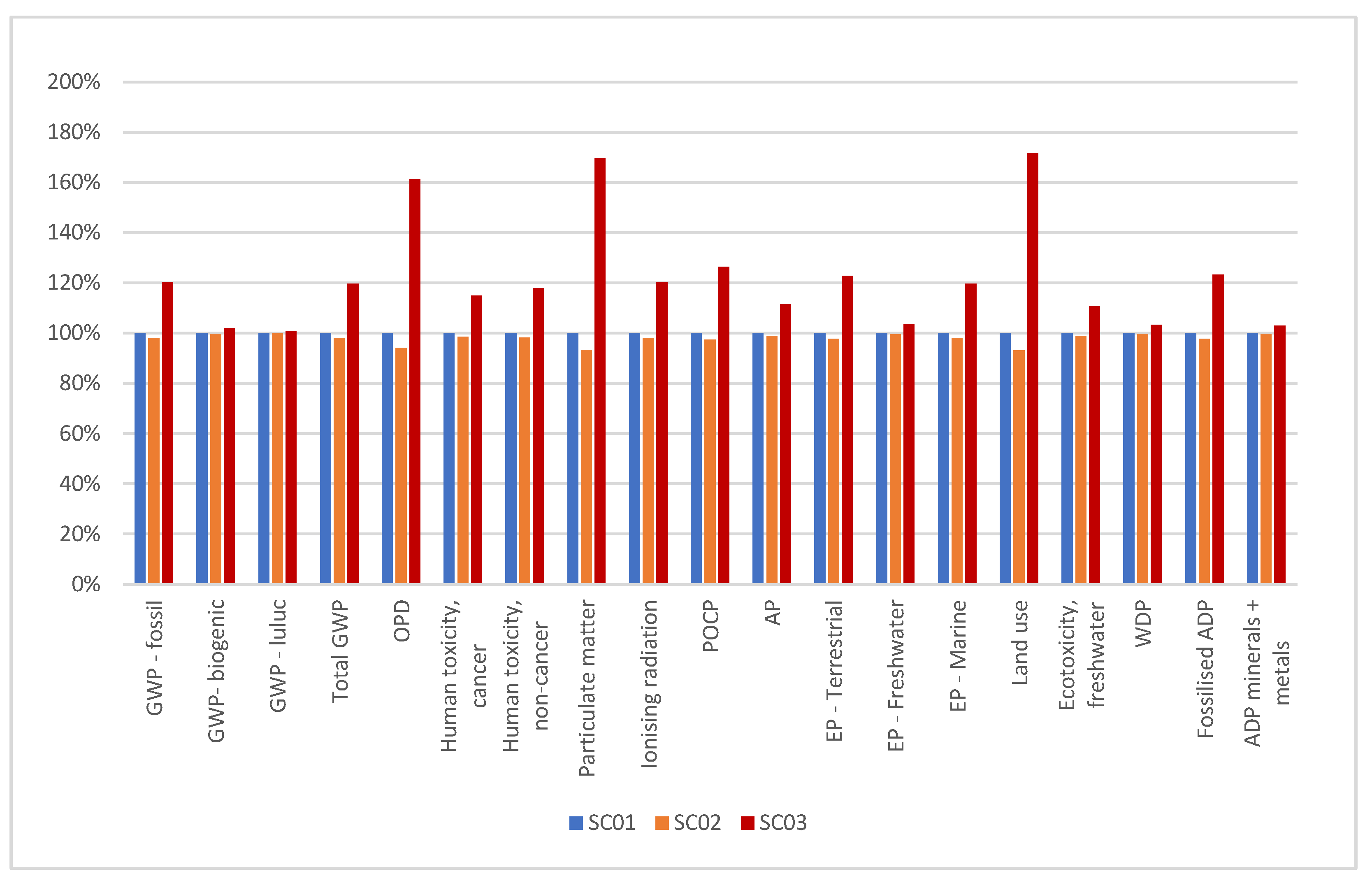 When compared to the one used in the study (SC01), SC02 showed more significant variations in the OPD, Particulate matter, and Land use indicators, with reductions of 5.78%, 6.57%, and 6.75%, respectively. The remaining indicators showed a reduction ranging from 0.07% to 2.48%.