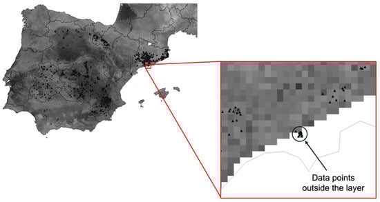 Soil properties of each plot were obtained using the Zonal Statistics Tool of QGIS to analyse the raster files from the European Soil Data Centre database and extract the values of cadmium (Cd), copper (Cu), nickel (Ni), lead (Pb), zinc (Zn), mercury (Hg), chromium (Cr) and pH at the exact coordinates [,]. In the case of exact coordinate points, the Zonal Statistics tool uses each plot coordinate as a ‘zone’ and samples the coincident cell value from the raster files (Cd, Cu, Ni, Pb, Zn, Hg, Cr and pH), extracting the exact value. Some plots (n = 292) presented a surface area of zero, likely owing to rounding or loss of decimal precision during file-type conversion, thus these records were excluded from the analysis. Similarly, plots with a reported sludge application mass of zero (n = 604) were removed, resulting in a final dataset comprising 27,835 plots. In some plots, the points were rendered outside the raster maps (28 points for Zn and 216 for pH), and these values were replaced with the overall average (Figure 2).